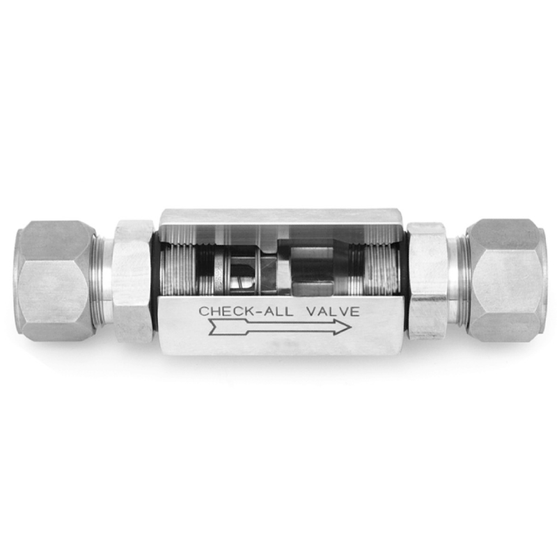 A three-piece tubing check valve with compression tube ends, supplied complete with nuts and ferrules and offers maximum flow with minimal pressure drop